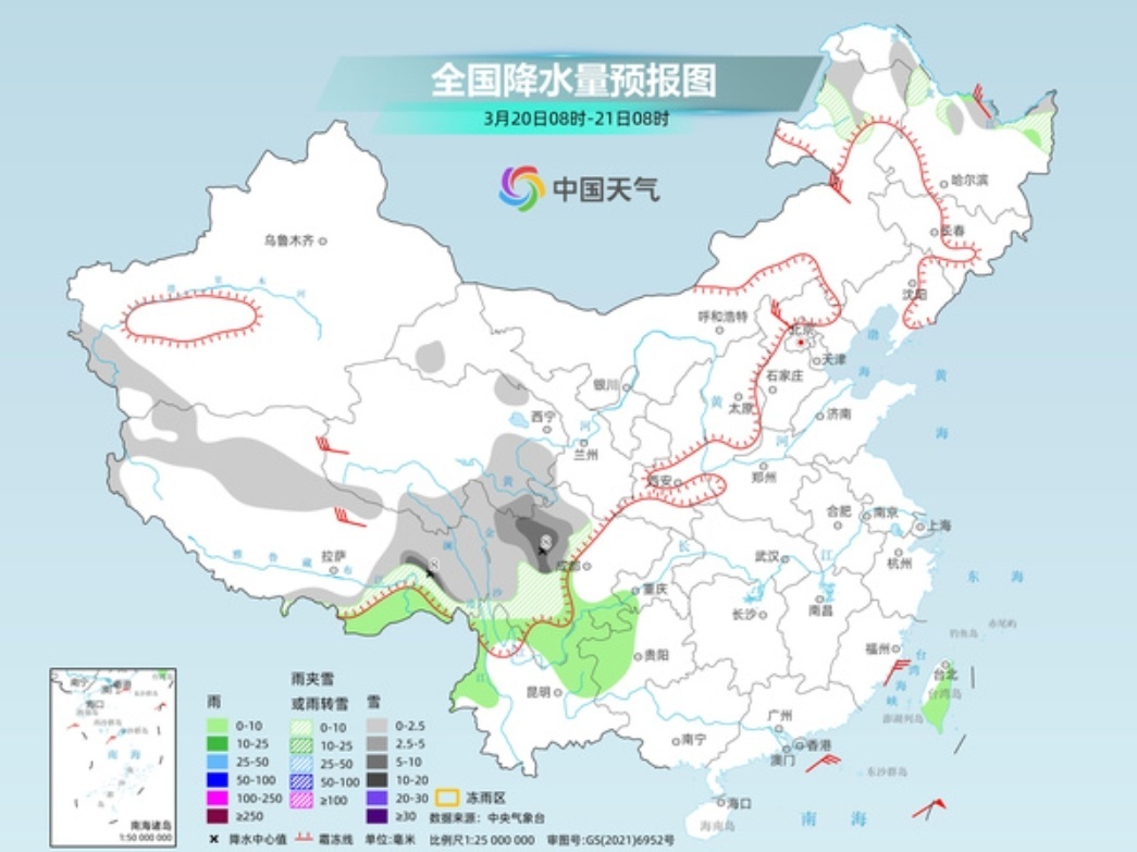 后天,新疆北疆北部、西藏中南部、川西高原中北部以及内蒙古东北部等地部分地区有小到中雪或雨夹雪,其中,新疆北疆北部、西藏东部等地部分地区有大雪,局地暴雪。新疆北疆低海拔地区、西藏东南部、四川南部、重庆中南部、湖北西南部、贵州北部、云南西北部和东北部等地部分地区有小雨,其中,西藏东南部等地部分地区有中雨。